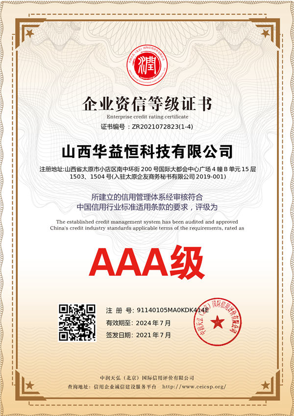 ↑ 華益恒AAA級(jí)企業(yè)信用等級(jí)證書(shū)